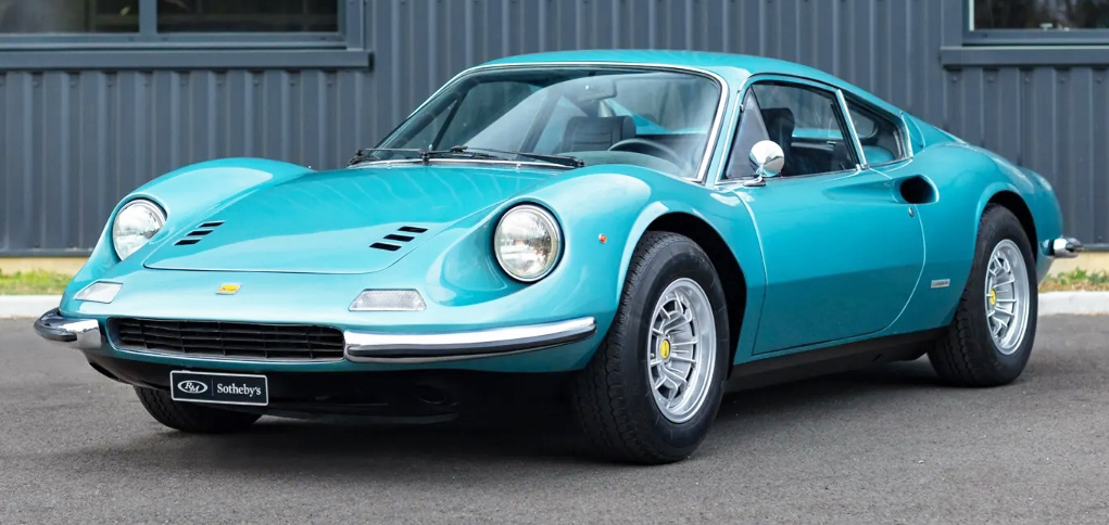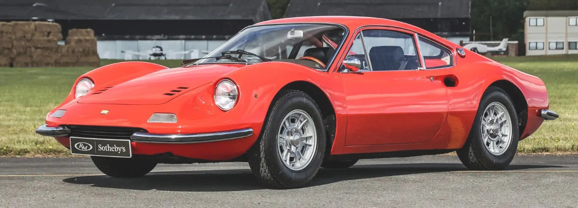 206 GT, S/N 00294 (1968). Rosso Dino with nero interior. Estimate £350,000 to £400,000. Completed on 20 December 1968, originally finished in Rosso Dino with a Nero Simipelle interior with cloth inserts colored orange. Delivered new to Roman dealer, Motor S.a.s. di Carla Allegretti e C, and two weeks later acquired by its first owner. The car was enjoyed by eight owners in its first 12 years in Italy. At some point after its return to Roman ownership in 1981 it stayed with the same family until 2016. After being acquired at auction in 2016, the car was registered in the UK in August of that year. Offered with a copy of its estratto cronologico (detailing its ownership history in Italy), maintenance manual, a pair of period correct Carello headlights, and toolkit. Lot 216. Sold for £421,250.