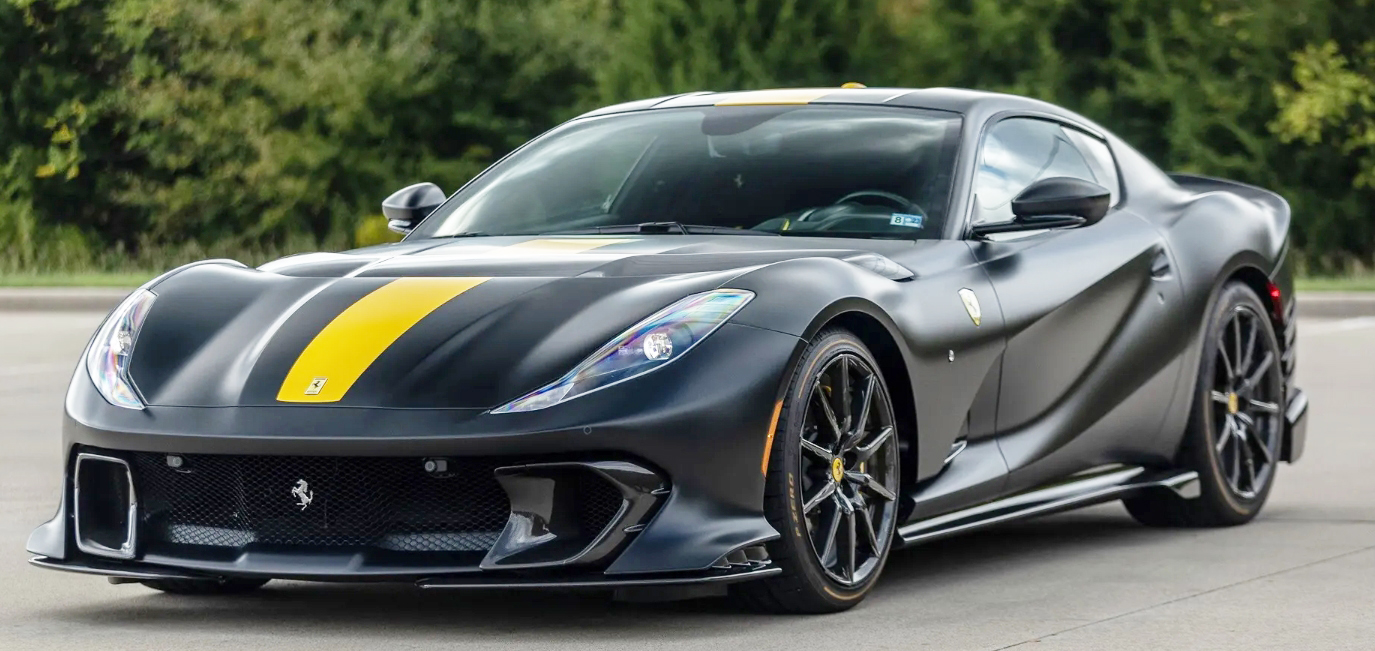 812 COMPETIZIONE, VIN ZFF03TLA9N0279874 (2022). Nero Opaco with nero Alcantara. Estimate $1.65 million to $1.95 million. NO RESERVE. Completed in March 2022, featuring more than $150,000 of factory options, many of them custom, reflected on the window sticker. Special-order “off-catalogue” matte black with a fly yellow center stripe. Yellow brake calipers and 20” carbon-fiber wheels. Pirelli P ZERO tires feature yellow detailing in their sidewall script. Carbon fiber engine cover, front air vents, rear diffuser, and filter box. Alcantara interior with contrasting stripes of yellow leather and stitching. The lower door covers, inner door handle, instrument cover, upper center console, steering wheel, and dash inserts are all finished in carbon fiber. Passenger display, Apple CarPlay, and high-fidelity sound system. Suspension lift system. 354 miles. Lot 7. Sold for $1.765 million.