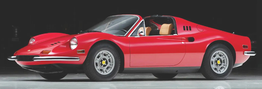 246 GTS, S/N 07730 (1974). Rosso Chiaro with beige leather. $500,000 to $600,000. No reserve. Completed in January 1974. Specified for the US market, power windows, air conditioning, Cromodora wheels and Daytona seats with black inserts. Distributed through Chinetti-Garthwaite and allocated to Continental Autos of Lake Forest, Illinois, and sold new to the company Brunner & Lay of Asheville, North Carolina. Over the next 10 years it passed through two additional owners before being acquired in 1984 by Bill Jacobs of Joliet, Illinois. Mr. Jacobs quickly sold to Michael Leventhal of Chicago, who retained possession for 35 years. A gradual accrual of recorded mileage suggests that the 6,597 miles on the odometer are original. In October 2019 it was issued a Red Book from Classiche. After being sold to the Dare to Dream Collection in January 2020, it was treated to a bare-metal refinish in the original color and the Daytona-style seats were rebuilt with new padding and leather upholstery. Documentation includes a filled-out warranty booklet, service invoices dating to 1985, a history report by Marcel Massini, and Classiche Red Book. Lot 349. Sold for $775,000.
